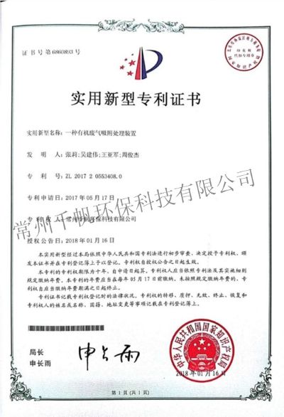 實用新型專利證書 一種有機廢氣吸附處理裝置